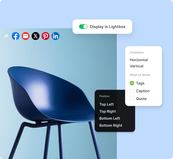 Go beyond basic share buttons with advanced customization options. Choose where and how buttons appear - on each image in the gallery or Lightbox view, adjust their position and orientation, and fine-tune settings for each platform.
