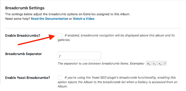 Then, enable breadcrumbs for that gallery by clicking the Enable Breadcrumbs checkbox: