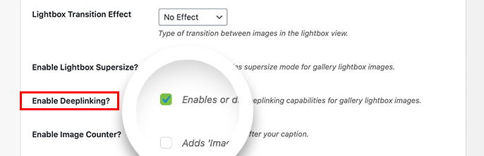 A: You can find deeplinking under the Lightbox settings in any gallery. If you do not see an option to enable deeplinking, then ensure that your addon has been activated. If it is active, then try clearing your plugin cache and refreshing the page.