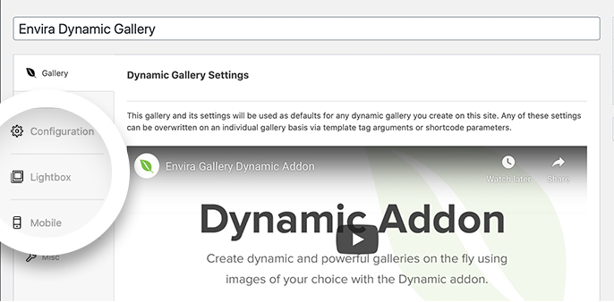 To convert your WordPress galleries into Envira Dynamic galleries, just look for the option on the Configuration tab of the Envira Dynamic Settings to Render all WordPress Galleries using Envira? Check this box, which will automatically take any WordPress gallery and change it to an Envira dynamic gallery using the settings from the Envira Dynamic Settings.