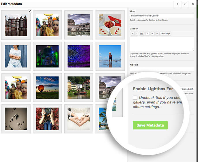 To edit the gallery from the album screen, click the blue pencil icon on the album. This opens a dialog that allows you to disable the Lightbox for that particular gallery. Simply uncheck the Enable Lightbox For Gallery? option and click Save Metadata.