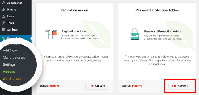 In this instance, you’ll need to activate the Envira Password Protection Addon.
