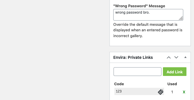 A: Yes! With the Password Protection Addon, you can now choose to generate private links for your protected galleries instead of setting passwords. This new feature ensures that only those with the private link can view your gallery. To generate a private share link, simply follow the steps above, then locate the box at the bottom of the right-hand panel called Envira: Private Links. There, you can input a link for your private gallery.