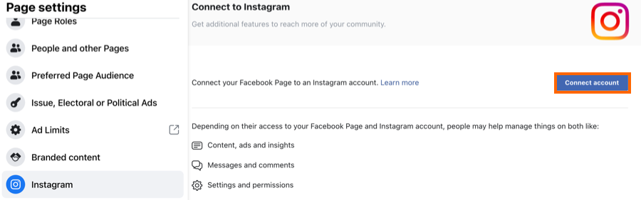 2. Once you have a Facebook Page, log in to your Facebook account and go to your Facebook Page. Then copy/paste the following onto the end of the URL: settings/?tab=instagram_management so that it looks like this: https://facebook.com/[YOUR-FACEBOOK-PAGE]/settings/?tab=instagram_management.