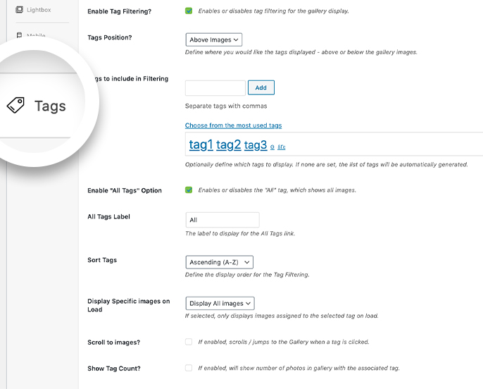 Enabling tags will reveal additional configuration options, including the position of the tags in relation to your gallery images, the tags you want to include in filtering, tag scrolling, and more.