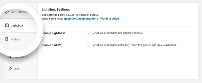 Once you’ve installed the Deeplinking Addon, open the gallery that holds the image you want to deeplink. Then scroll down to the settings pane and click the Lightbox tab: