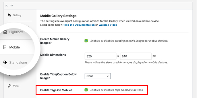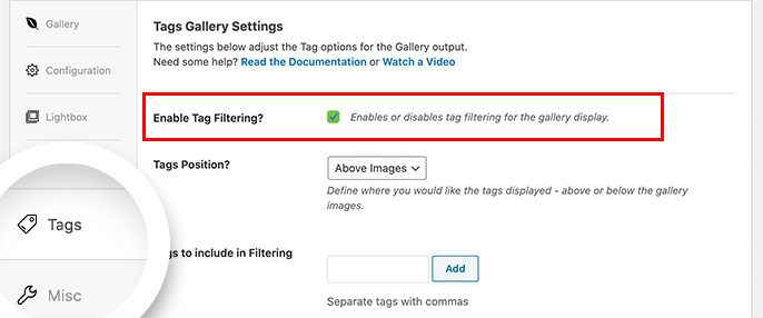 Enabling tags will reveal additional configuration options, including the position of the tags in relation to your gallery images, the tags you want to include in filtering, tag scrolling, and more.