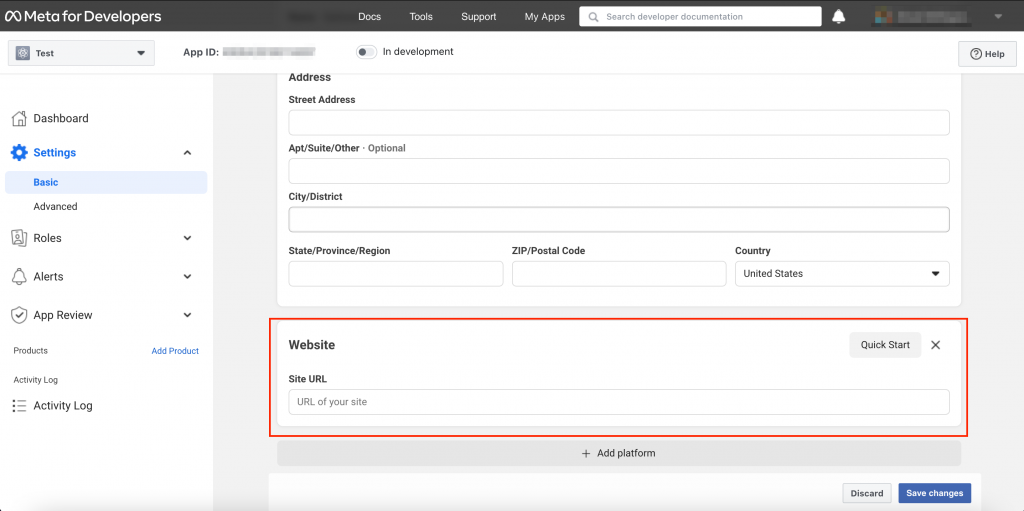 Then click the Add Platform button (at the bottom of this page) so you can add your website URL.