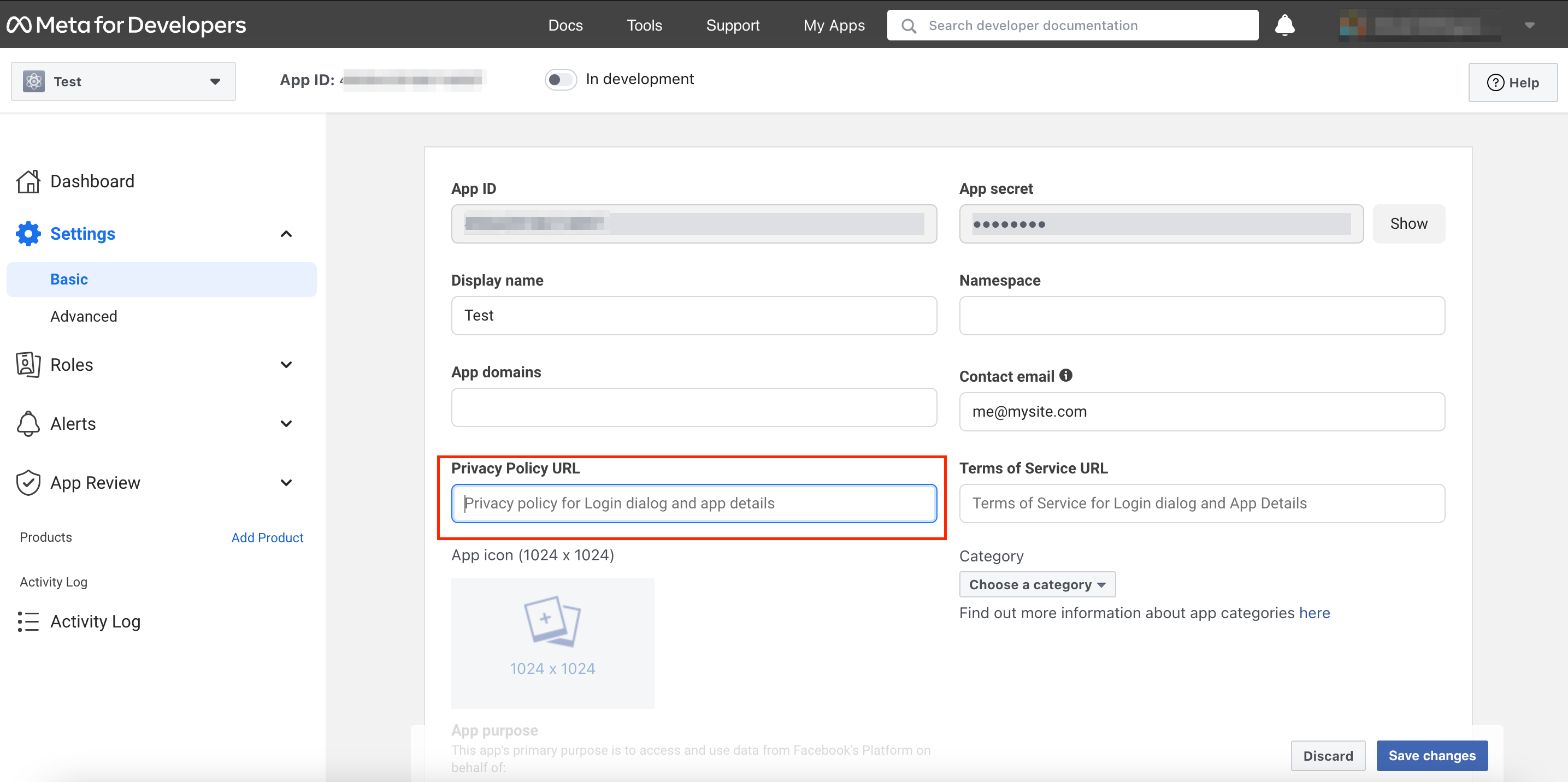 Next, click the Settings from the left side menu and add the URL for your Privacy Policy. If you don’t have one, you can simply enter your site URL.